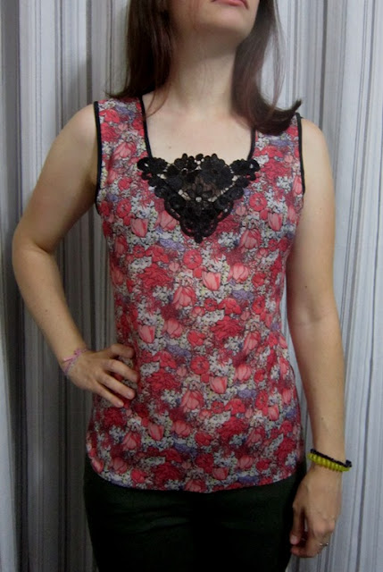 E eu ainda fiz uma blusinha, de um paninho bem leve e fininho estampado de flores que ganhei de aniversário há uns 4 anos atrás, da minha mãe - mas resolvi fazer uma regata prá Naninha, pois tá um calor tão insuportável e ela aprecia. Não faz mal que era tecido prá mim, mãe tem dessas coisas mesmo, acaba sempre dando prioridade pros filhinhos, não é mesmo? Aposto que vocês também são assim...