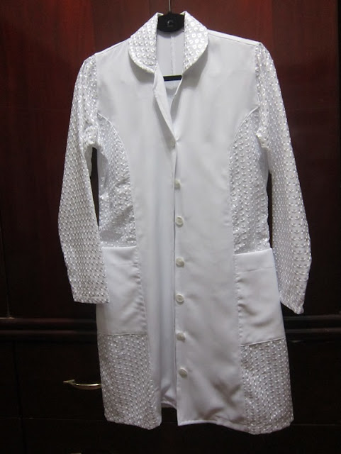 Ainda lhe fiz dois jalecos novos, um deles mais comum e outro usando retalhos de laise bordada prá enfeitas, olha só:
