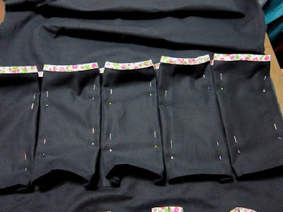 | Reparem que antes eu preparei a tira que vai fazer os bolsos: fiz bainha na parte de baixo e apliquei viés florido na borda. |