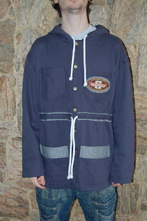 Esse casaco eu fiz copiando um casaco meu (é masculino, é largo, é grande, tenho que dobrar prá fora as mangas prá caber em mim mas eu adoro, de jeans forrado de flanela xadrez, quentinho e cheio de bolsos e ganhei da minha irmã faz uns - o quê? - vinte anos...). Cabe no meu moleque mas ele não gosta de jeans, então eu fiz de moletom. Foi experiência científica, deu certo, já repeti a façanha e fiz outros 2 - depois eu posto.