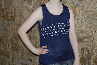 Frente: Montar 148 pontos, regulagem 7. Tecer 100 carreiras. Começar as carreiras de furinhos, pulando um ponto a cada cinco, com intervalos de 6 carreiras. Tecer 7 carreiras de furinhos. Após a última carreira de furinhos, tecer mais 4 carr. e fazer as cavas, diminuindo, de cada lado, a cada duas carreiras: 9, 4, 3, 2, 2, 1 (7 vezes), ficando com 94 pontos. Fazer o arremate do pescoço na carr. 170, arrematando 24 pontos, separando o trabalho em dois e diminuindo, a cada duas carreiras, no lado do decote: 5, 4, 3, 2, 2, 1 (5 vezes), ficando com somente 14 pontos. Arrematar todos na carreira 214. Fazer as costas sem as carreiras de furinhos e com o decote na carreira 186. Costurar os ombros e os lados. Fazer duas carreiras de ponto baixo com a agulha de crochê ao redor do pescoço e dos braços. Fazer 7 carreiras de ponto baixo na barra.