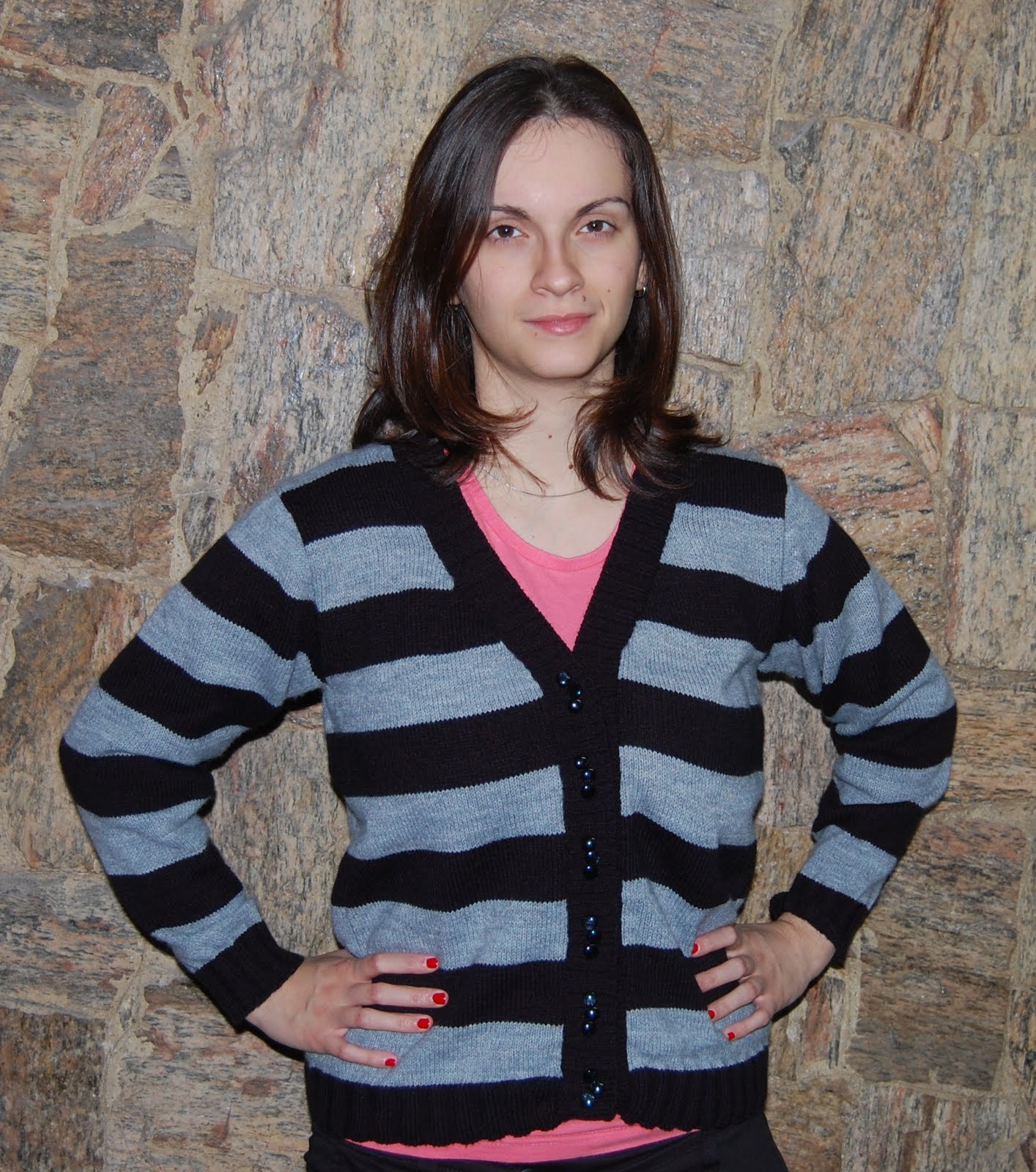 Então tá, a blusa foi super rápida de fazer, porque não tem pontos trabalhados nem nada, as diminuições são bem simples, ficou pronta num tapinha. Não gosta de listras? Faz de uma cor só, mas aproveita a idéia dos três botõezinhos, fica um charme. Calculo que, no total, a blusa saiu por: 15 contos a lã e 1 real os botões = 16 tostõezinhos...