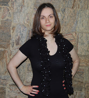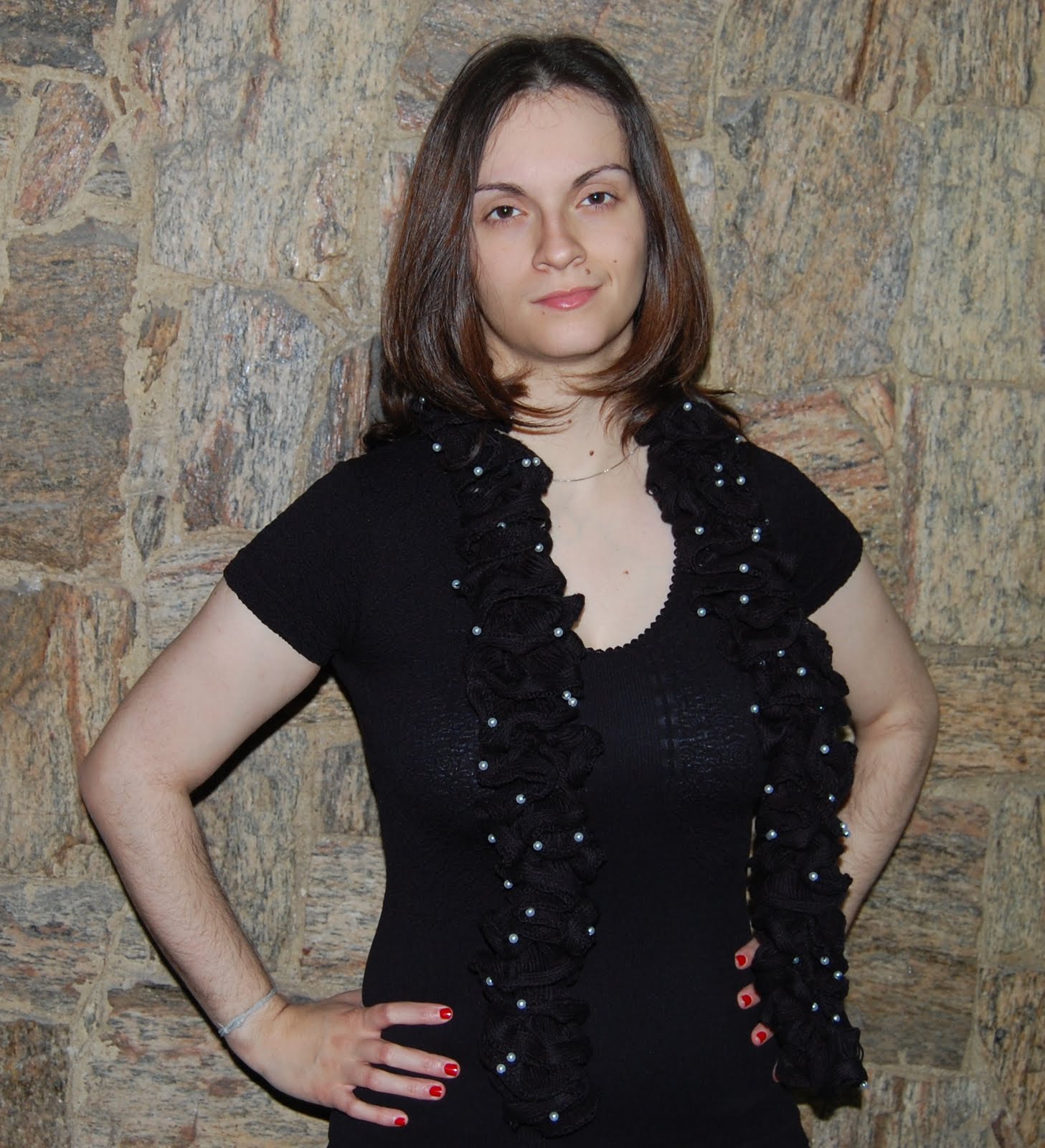 Ah, vamos supor que você não tem máquina: compra uma cristal preta e faz uma tela de crochê, daquelas que a gente faz umas 15 correntinhas, mais 5 para virar e faz 5 quadradinhos, formados por ponto alto, duas correntinhas, ponto alto, duas correntinhas, etc. Se - antes de começar o trabalho - você já enfiou as pérolas na lã, é só fazer o seguinte: escolhe um lado para ser a lateral externa do babado e, a cada 4 carreiras, intercale nesse ponto de borda uma pérola. Segue "toda vida" fazendo isso, e, ao mesmo tempo que intercala a pérola, no lado oposto dela você prende uma carreira lá de baixo com um ponto baixíssimo na carreira atual, já formando o franzido do babado. Deu prá entender? Quando tiver o dobro do comprimento de cachecol que você quer você dobra ao meio e prende um babado no outro, para ficar duplo. Viu só? É só ter boa vontade e imaginação que tudo dá certo, não deixa nada te segurar!