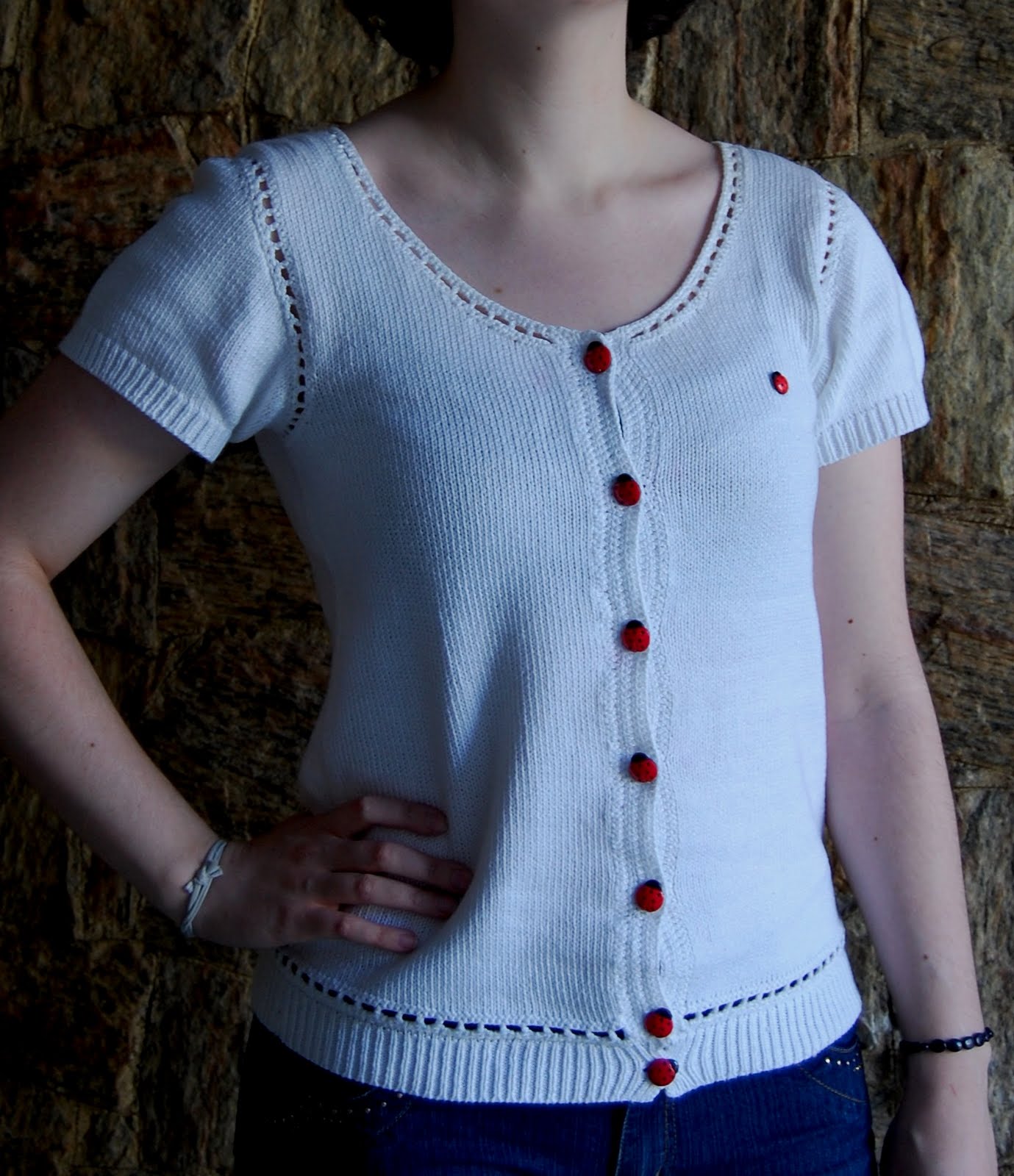 Esta é uma blusinha muito fácil de fazer e que fica muito linda. Tudo que você precisa são 3 novelos de linha Anne (ou 3 de Cléa ou Pingouin 1000 usada dupla) e os botões de joaninha. A linha vai sobrar quase um novelo inteiro, mas tem que ter 3. Faz em ponto simples a parte da máquina (avesso em tricô, direito em meia) e depois crocheta os entremeios rendados, dando esse efeito diferente.