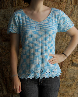 Uma blusinha despretensiosa, que você faz rapidinho tendo máquina de tricô. O charme: um rendado feito na barra com o transportador e um distante canelado que você faz colocando fora do trabalho (como quando se faz "barra doble") algumas agulhas a espaços regulares. Usei os marcadores numéricos da máquina para me guiar. Por fim, uma carreira de ponto baixo no decote e nas mangas e um biquinho mais elaborado no barrado. A receita você pode usar qualquer uma que você tenha ou pega uma minha AQUI. Manequim 42/44. Custo: R$14,00.