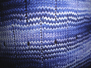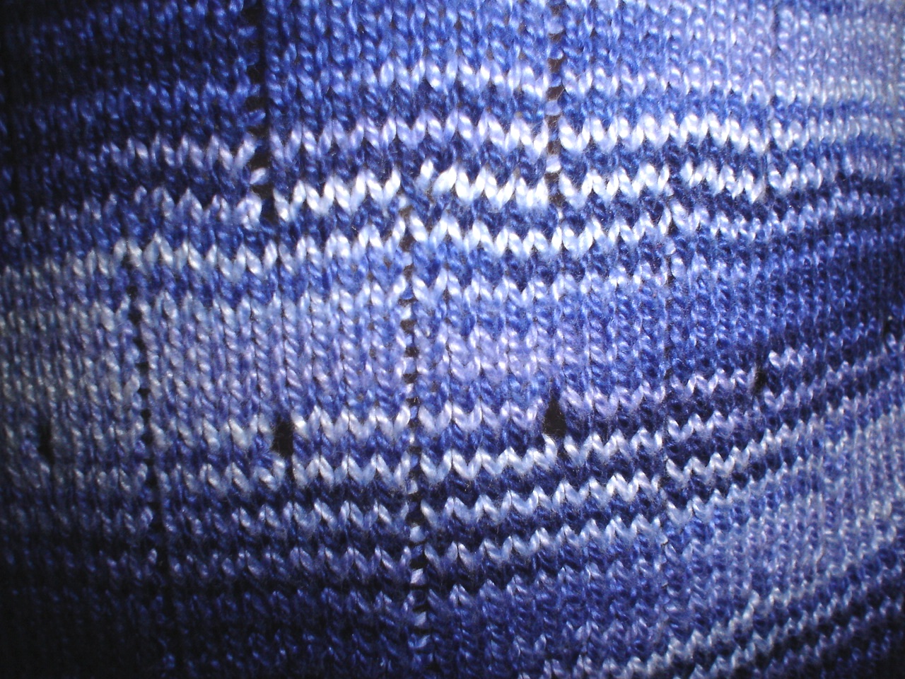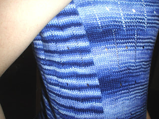 Olha como o trabalho fica diferente na frente e nas costas: como o fio é mesclado, com um comprimento mais ou menos homogêneo de cada cor, quando você faz as costas (sem abotoamento) e a frente (com abertura para abotoar) a largura do trabalho é diferente, então ficam listas menores atrás e listas maiores na frente...