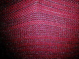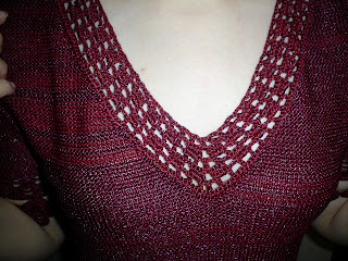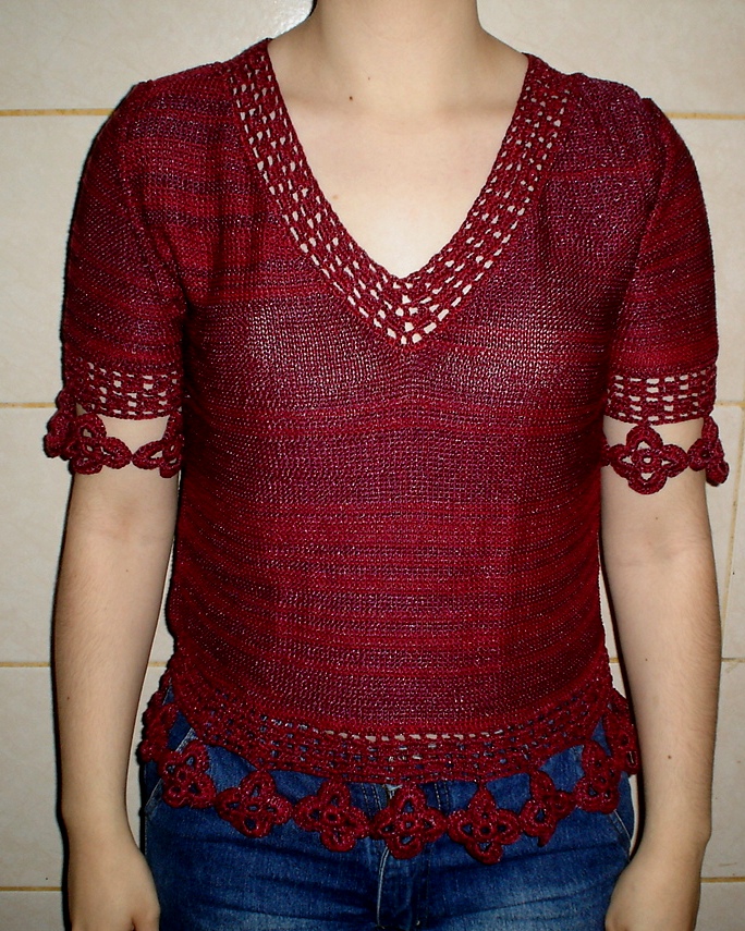 Acho que vocês já repararam que eu adoro misturar as duas técnicas. Esta blusa nasceu de um novelo de linha Cléa, na cor vinho, que sobrou e que não queria virar biquinho em pano de prato. Daí procurei na loja perto de casa uma linha brilhante, dessas de cone, e acabei comprando Princesinha, cuja cor era mais ou menos parecida e que desse para fazer na máquina. Usei os dois fios juntos, um em cada passador de fio.