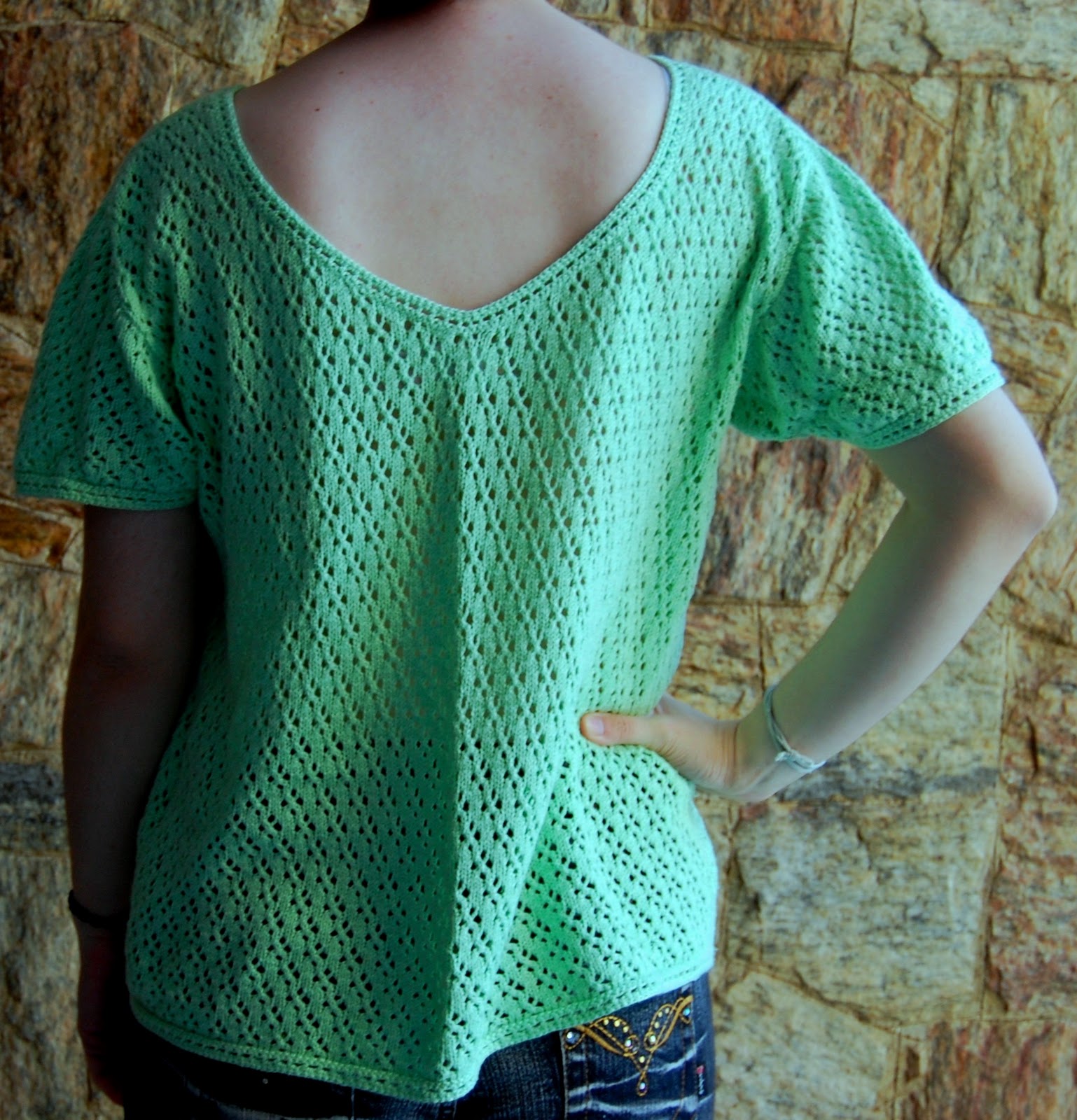 Esta blusa é minha (por isso parece tão grande na Naninha...), tamanho 46, feita com 3 novelos de Anne 500 na máquina, regulagem 9, mesma quantidade de pontos da blusa azul de duas postagens atrás. Você faz um decote na frente e outro atrás - e pode escolher qual usar na frente e qual usar atrás, pois a blusa é reversível. O decote da frente é V, começado na carreira 20 após o início da cava, diminuindo um ponto cada 2 carreiras até sobrarem 26 pontos para os ombros; o decote de trás é princesa, começado na mesma carreira, diminuindo 1 ponto a cada carreira (na metade do tempo você alcança os 26 pontos do ombro...), daí seguindo reto. Você pode fazer redondo de um lado, V do outro, V dos dois lados, canoa na frente e V atrás começando na mesma altura da cava (daí fica mais decotado ainda, sua sapequinha...).