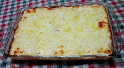 Agora a montagem: Na travessa que vai servir põe um pouco desse bacalhau cremoso, arruma fatias de muzzarela por cima, deita as rodelas de batata, se quiser põe mais queijo. Cobre com o restante do bacalhau cremoso, mais queijo (se quiser) e, por último, bastante queijo ralado. Eu prefiro comprar um pedaço de queijo e ralar eu mesma que comprar queijo de pacotinho: é mais gostoso e fica mais bonito.