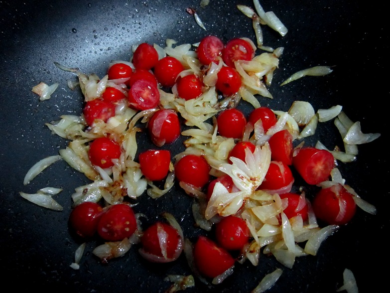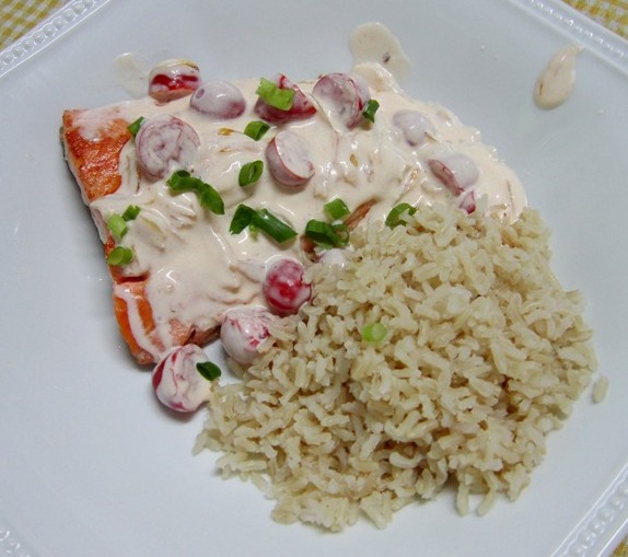 É que eu tava sem alcaparras e queria fazer o salmão, então usei o que tinha - e essa é a magia da cozinha: se virar com o que tem, usar a imaginação, experimentar. Meu molho, depois de fritar a cebola e antes de jogar o creme de leite, recebeu uns tomatinhos cereja cortados ao meio - lindos, vermelhinhos, adocicados. Mas foi só prá saltear eles, nada de fritar - eu gosto que eles mantenham o jeitinho e a leve crocância de crus... Prá enfeitar, cebolinha verde picadinha, que também dá um gostinho.