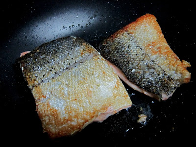 "Vamulá"... - O PEIXE. Comprei fresco, um filé de pouco mais de meio quilo, ao custo de 12 reais. Limpinho, rosado e de cheiro suave. Lavei, cortei ao meio e deitei na frigideira antiaderente com um pouco de óleo de girassol, no fogo baixo. A PANELA: anti-aderente da boa, pesadona, que é pro peixe ir grelhando devagar, sem queimar. Prá quê óleo se não adere a comida? Pro sabor, colega! Fica mais gostoso, mas se você é light, dispensa. "Mas não precisa temperar o peixe de antemão,com limão, sal, etc, Dona Rosa?" Sei lá, deve ficar - eu sempre faço direto... O SAL: não é qualquer sal - é o sal temperado de alho que eu faço... Passo o alho no processador, soco com sal no pilão e uso prá tudo: 1 cabeça de alho por quilo de sal marinho. Vale a pena porque fica tudo com um leve sabor de alho e eu não preciso ficar sempre com as mãos cheirando...