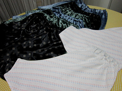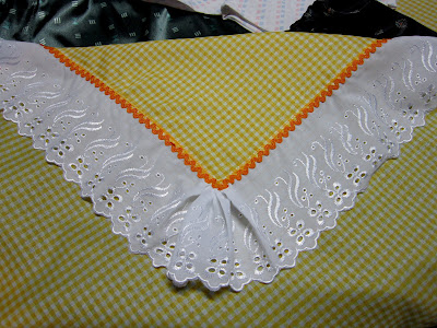 Sim, porque os outros já estão em petição de miséria: descasco batatas, seco as mãos neles prá atender correndo à porta ou ao telefone, e assim ficam tão manchados que nem cândida clareia... Uma vergonha, eu sei... Mas prá isso existem retalhos baratos e calças velhas: o escuro, cheio de babados, era uma calça jeans lycra da Lolinha - vai me render 2 aventais, este já terminado e outro a caminho; o verde foi um retalho de brim comprado a quilo na 25 de março (1 quilo de tecidos variados por 6 reais - coisa prá caramba! Fazendo os cálculos, o avental saiu por 50 centavos!
